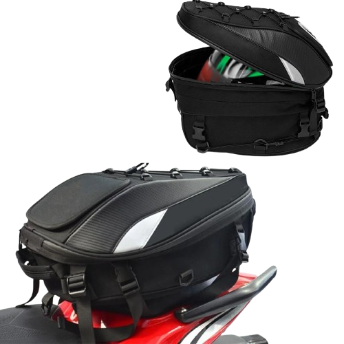 A fixação traseira é universal, utilizando cintas ajustáveis que prendem o baú/mochila no banco ou bagageiro da moto, garantindo estabilidade mesmo em velocidades elevadas. Leve, prática e multifuncional — perfeita para quem precisa de uma solução híbrida entre mochila e bauleto.